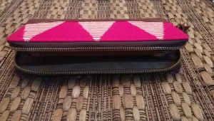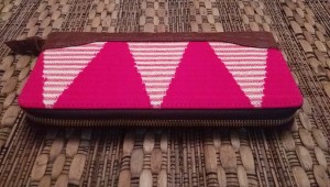 Dompet ini terbuat dari kombinasi kulit sapi dengan kain tenun rang-rang Bali.